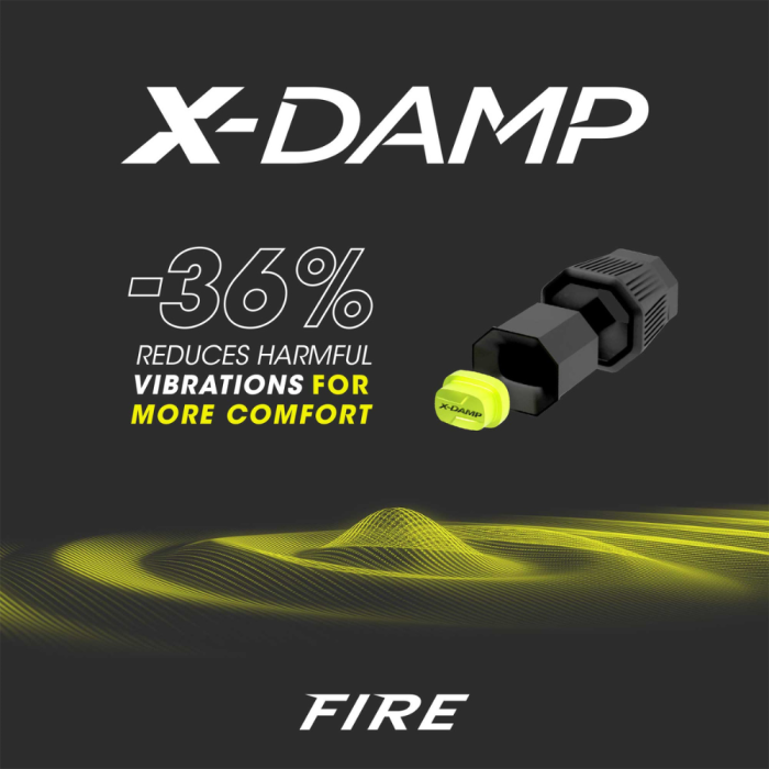 So funktioniert es Am unteren Ende des Griffs befindet sich ein Stahlpfropfen in einem Elastomerbeutel, der sich bei jedem Aufprall des Balls gegenläufig der Kraft bewegt. Das Ergebnis: 36% weniger schädliche Vibrationen für den Arm und weniger Ermüdung.Zusätzlicher Tipp von Tecnifibre: Je leichter ein Racket ist, desto mehr Vibrationen erzeugt er, und wird in der Regel von jüngeren Spielern gespielt. Die X-DAMP-Technologie ist daher die effektive Lösung, um hart zu schlagen und gleichzeitig unge Spieler zu schützen.Das neue FIRE 270 Tennisracket für Erwachsene bietet noch mehr Power als die vorherige Produktlinie!Zunächst einmal wurde die Ergonomie der Rahmensektionen überarbeitet, die nun quadratischer und um 5% dünner sind, um mehr Stabilität und Kontrolle der Power zu gewährleisten.Zudem wurde die Gewichtsverteilung geändert, um den Trends des modernen Tennis gerecht zu werden. Das Gewicht wurde von den Rändern zur Mitte des Rahmens verlagert, um das Swingweight zu reduzieren und die Beschleunigung des Racketkopfes zu optimieren. Maximale Power und Handlichkeit machen ihn zu einem perfekten Racket, das den Anforderungen des modernen Tennisspielers entspricht!Um die Leistung noch weiter zu steigern, wurde die Form des Griffs verfeinert. Ziel ist es, die Kanten besser zu spüren, um den Griffwechsel zu erleichtern.Alles in allem ist das TECNIFIBRE Tennisracket für Erwachsene FIRE 270 Weiß & Gelb 645cm² das ideale Produkt für modernes Tennis, kraftvoll mit einzigartiger Komfort-Technologie und super handlich.
